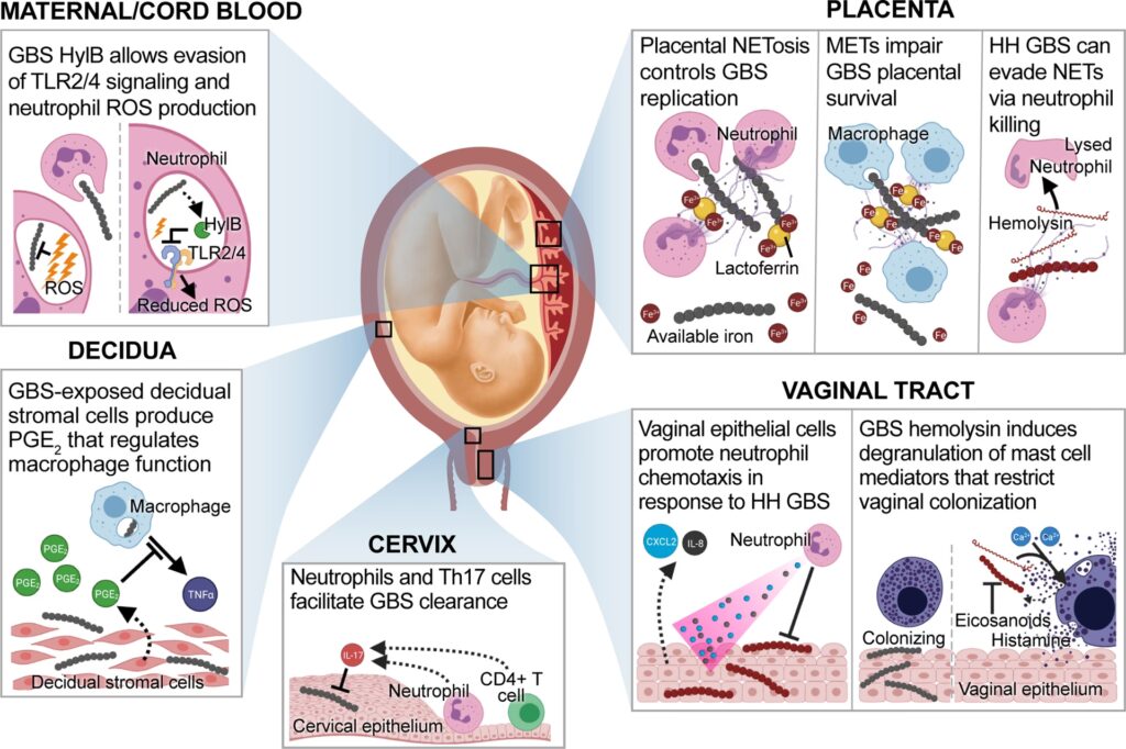 Når en gravid kvinde er bærer af GBS i skeden, kan bakterierne bevæge sig op gennem livmoderhalsen og inficere fosterhinderne. Dette er især en risiko, hvis vandet er gået, da den beskyttende barriere mellem livmoderen og den ydre verden er brudt. Infektionen kan føre til en række alvorlige komplikationer, herunder for tidlig fødsel, for tidlig vandafgang og infektion hos både mor og barn efter fødslen. Symptomer på chorioamnionitis kan omfatte feber, ømhed i livmoderen, ildelugtende udflåd og en forhøjet hjerterytme hos både mor og foster. Det kræver øjeblikkelig behandling med antibiotika for at beskytte både mor og barn.