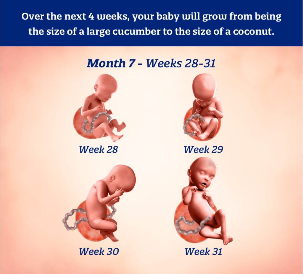 Inde i maven er din baby i fuld gang med at forberede sig på livet udenfor. Lungerne er et af de sidste store organer, der modnes. De begynder nu at producere surfactant, et vigtigt stof, der forhindrer de små luftsække (alveoler) i at klappe sammen, når babyen trækker vejret efter fødslen. Din baby kan nu også åbne og lukke sine øjne og kan sandsynligvis fornemme store ændringer i lys og mørke gennem maveskindet. Der dannes mere fedt under huden, hvilket glatter rynker ud og hjælper med temperaturregulering efter fødslen. Hudcellerne producerer melanin, pigmentet der giver huden sin farve. Ved udgangen af 7. måned vil din baby veje omkring 1,5 kg og være cirka 40 cm lang.