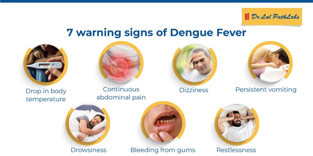Hvis nogen af disse symptomer opstår, skal du ikke vente på, at blodpladetallet falder yderligere – søg øjeblikkelig lægehjælp. Disse tegn kan indikere udviklingen af alvorlig dengue, såsom Dengue Hemorrhagic Fever (DHF) eller Dengue Shock Syndrome (DSS).