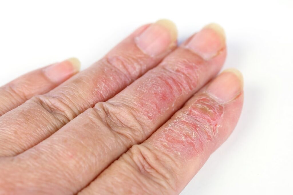Denne reaktion er en form for irritativ kontaktdermatitis, ikke en allergisk reaktion. Det er en direkte fysisk skade på hudens barriere, som kan afhjælpes ved at bruge en god fugtighedscreme eller neglebåndsolie efter brug af acetone.
