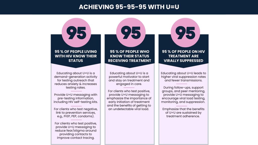 Hovedformålet er at afslutte AIDS-epidemien som en global sundhedstrussel inden 2030 ved at sikre, at næsten alle, der lever med HIV, er diagnosticeret, modtager behandling og opnår viral suppression. Dette forbedrer individuel sundhed og forhindrer nye infektioner.