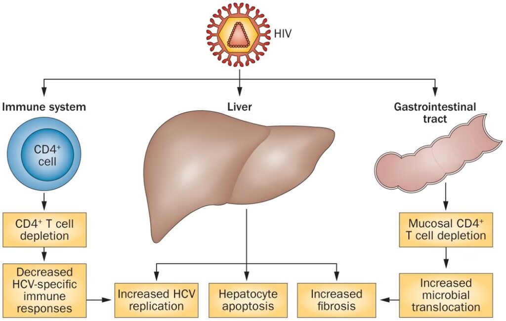 At have både HIV og Hepatitis C er mere end blot summen af to separate sygdomme. De to vira interagerer på en måde, der kan forværre helbredsudsigterne markant. HIV-infektionen svækker kroppens immunsystem, hvilket er kroppens primære forsvar mod infektioner. Et svækket immunforsvar har sværere ved at bekæmpe og kontrollere Hepatitis C-virussen. Dette fører til, at HCV kan formere sig hurtigere og forårsage mere skade på leveren på kortere tid.