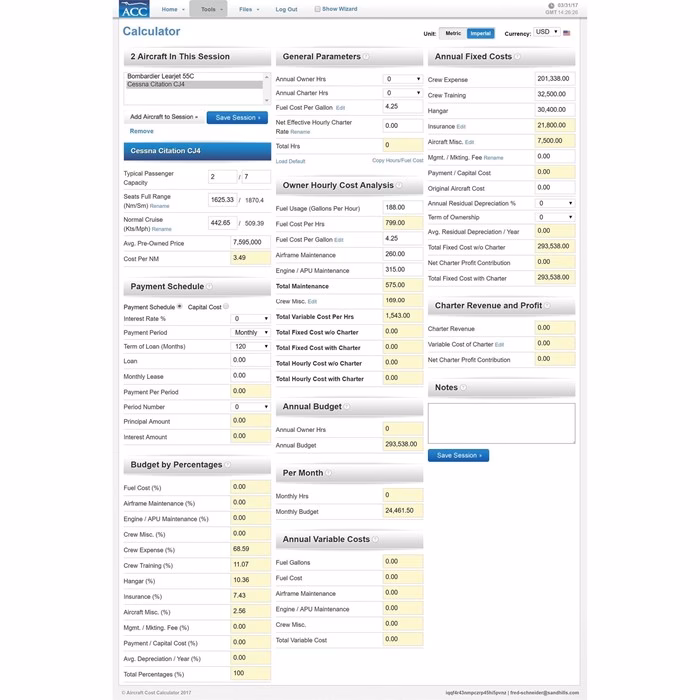 - Indtast Brugsdata: Angiv det forventede antal årlige flyvetimer. Dette er en af de vigtigste faktorer for de variable omkostninger.