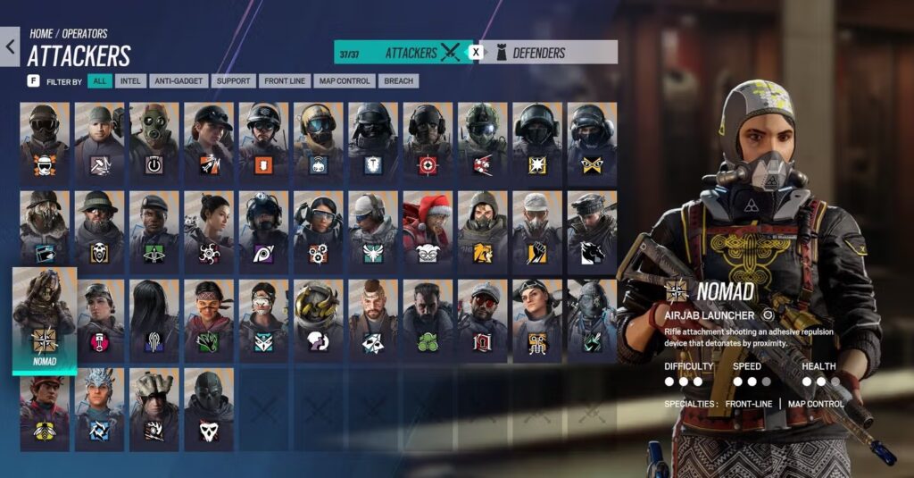 • Utility/Support: Denne gruppe hjælper holdet med at overkomme forsvarsværker. Thatcher kan deaktivere elektronik med sine EMP-granater, hvilket er en direkte modstander til mange forsvarere. Nomad og Gridlock kan dække flankerne og forhindre forsvarere i at rotere.