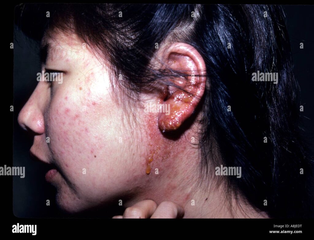 - Væskende sår og skorpedannelse: Hvis blærerne brister, kan området væske, hvilket kan føre til dannelse af gullige skorper. Dette er også et tegn på, at der er risiko for en sekundær bakteriel infektion.