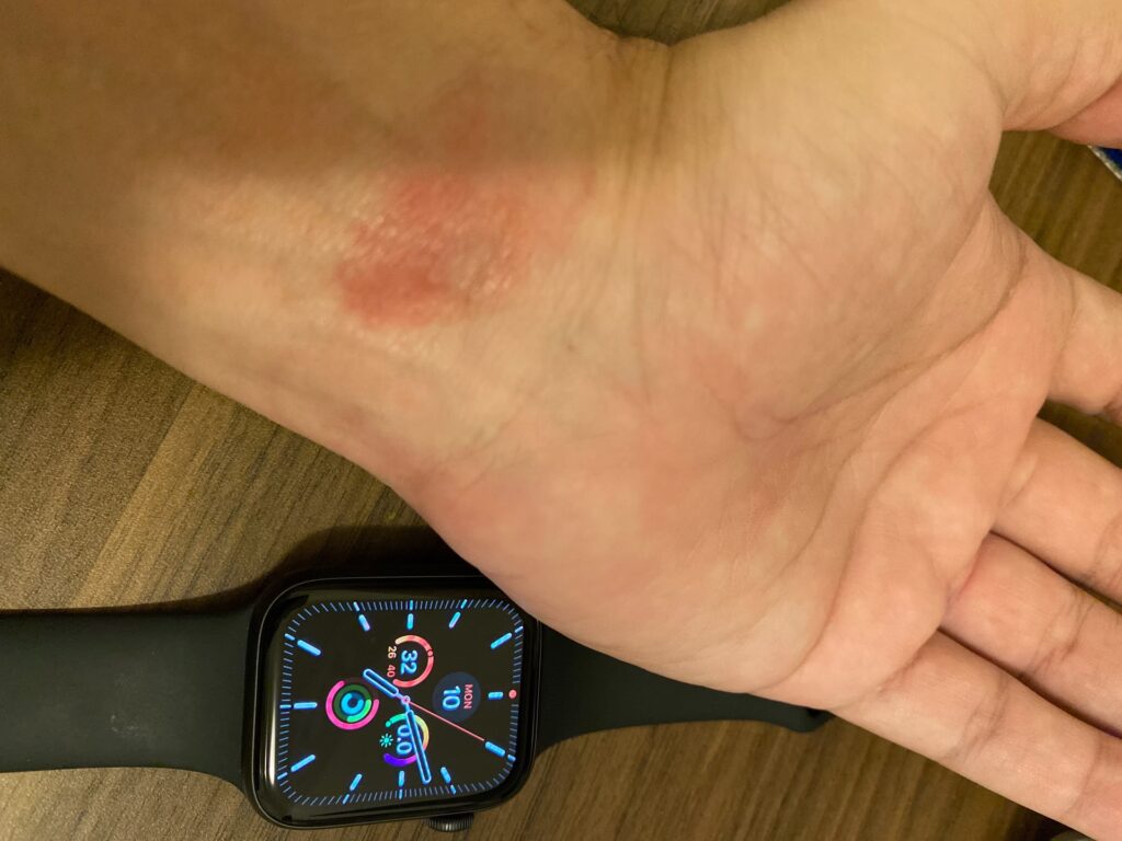 Reaktionen opstår typisk præcis der, hvor metallet har haft kontakt med huden, ofte under urkassen eller ved spændet.