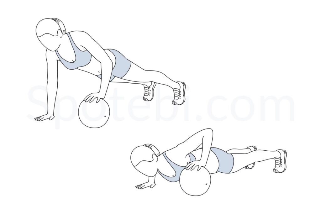 - Hold medicinbolden foran kroppen. Sænk bolden ned mod hoften på samme side som dit bagerste ben.