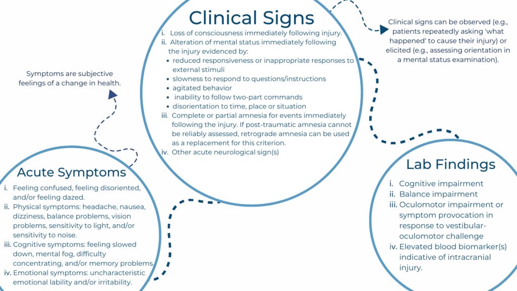 Det er afgørende, at alle symptomer dokumenteres omhyggeligt ved den første konsultation. Dette skaber et vigtigt referencepunkt, som kan bruges til at vurdere patientens fremskridt over tid, især hvis symptomerne bliver langvarige. Selvom der forskes intensivt i blodbaserede biomarkører for at diagnosticere hjerneskader, betragtes de stadig som værende på et eksperimentelt stadie og anbefales endnu ikke til rutinemæssig brug i klinisk praksis.