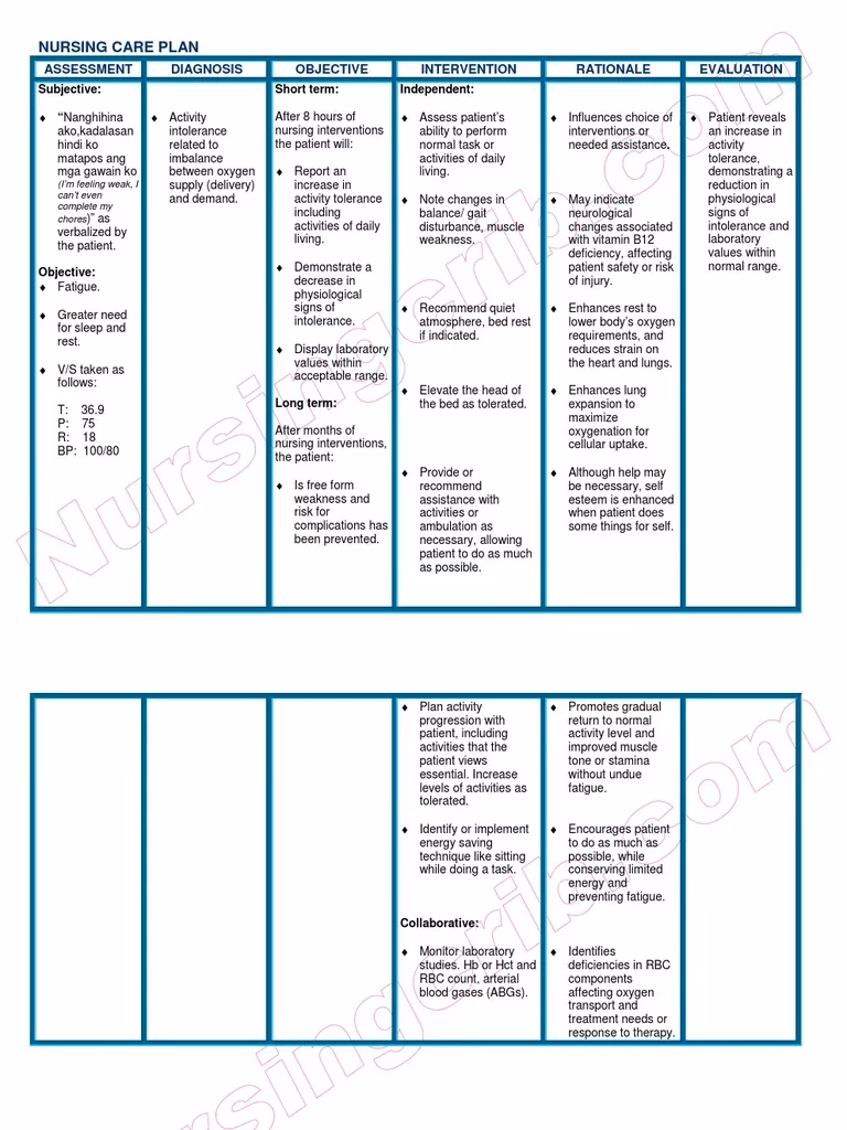 The following are some nursing diagnoses that may be suitable for patients with anemia: Fatigue is related to the decreased oxygen-carrying capacity of red blood cells. Ineffective breathing pattern related to shortness of breath and decreased oxygen levels. Risk for injury related to dizziness, weakness, and impaired balance.