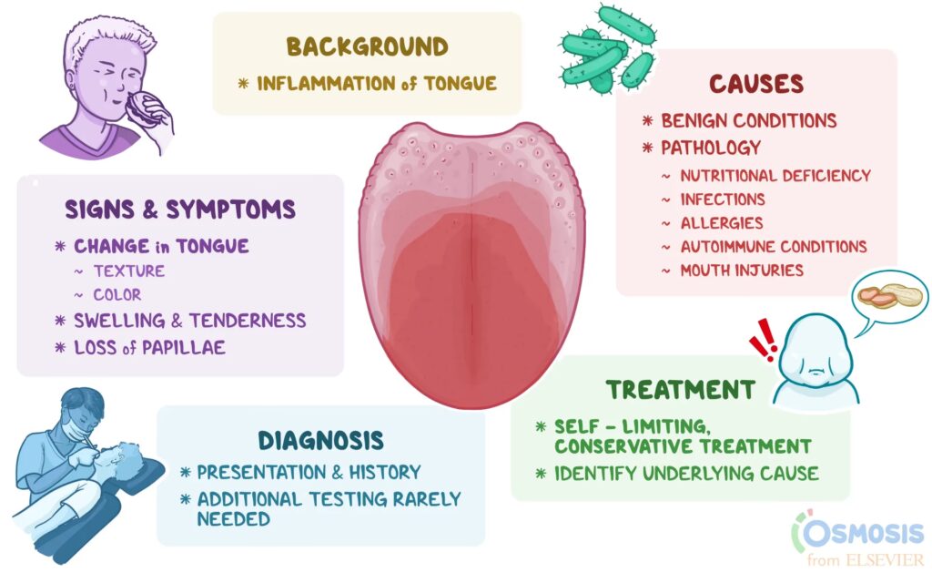 - Ømhed: Tungen kan være meget følsom eller smertefuld ved berøring.