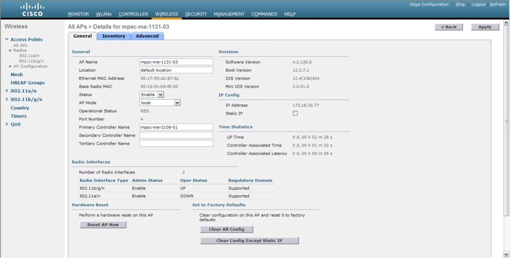 AP har status 'Down' i controlleren.Forbindelsesproblem eller konfigurationsfejl.Ping AP fra controller. Tjek AP Group og WLAN-tildeling.