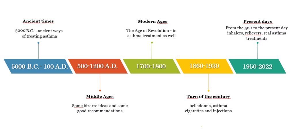 I begyndelsen af det 20. århundrede var de primære lægemidler belladonna-alkaloider (ofte røget i cigaretter) og adrenerge stimulanser som adrenalin, der blev givet som en indsprøjtning for at lindre akutte anfald.