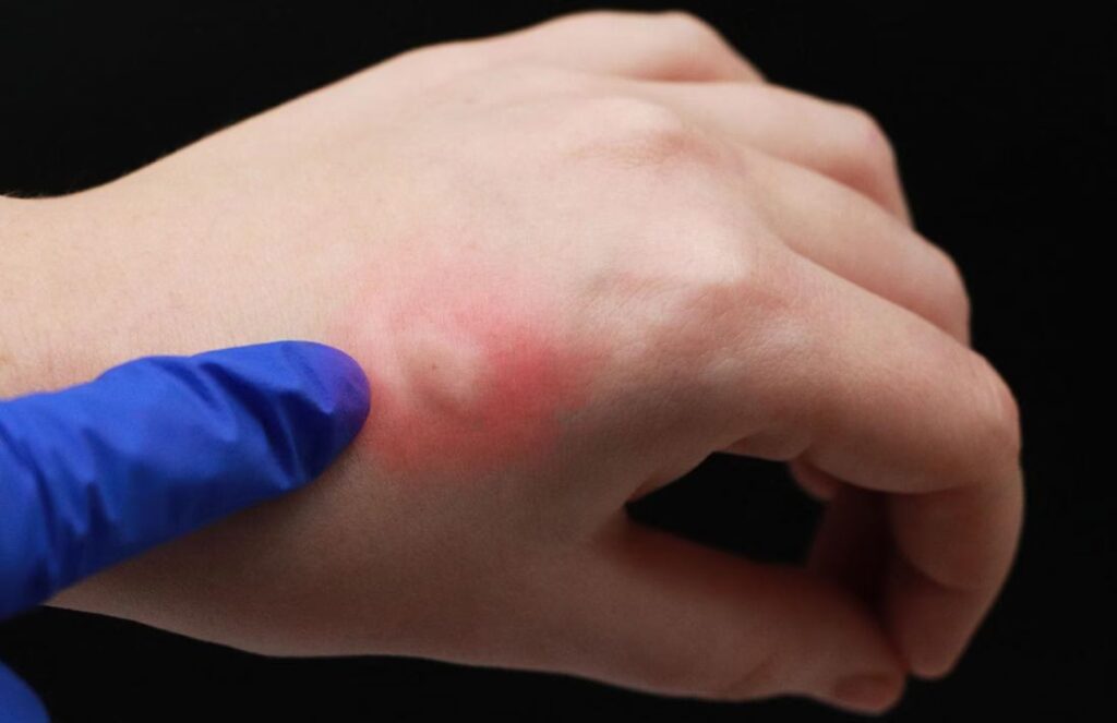 - Ekstrem hævelse: Området omkring stikket kan svulme op til en betydelig størrelse. Et stik på armen kan for eksempel få hele underarmen til at hæve.