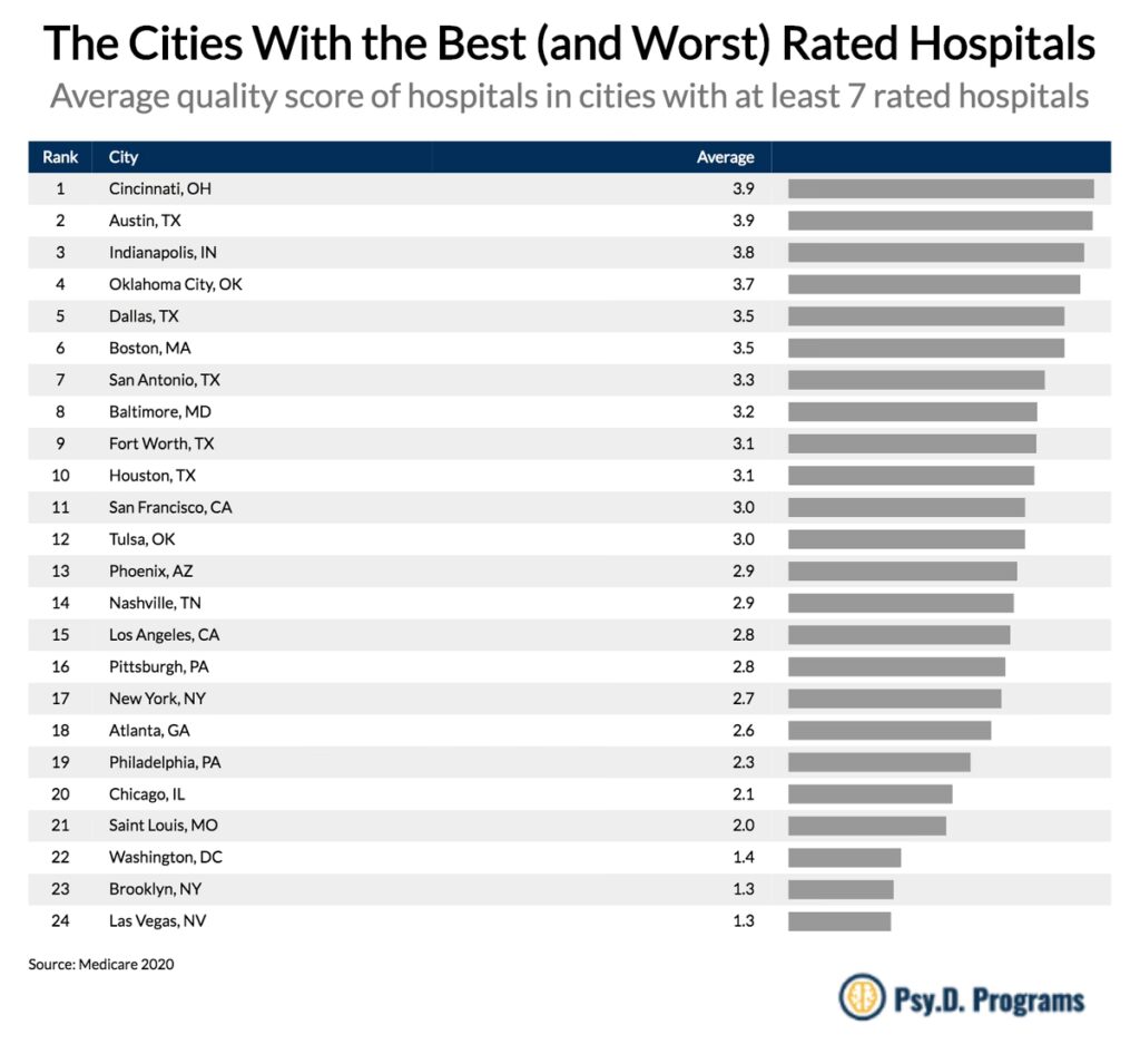 U.S. News & World Report, nu i sit 36. år, evaluerer over 4.400 hospitaler baseret på en bred vifte af faktorer. Deres metode lægger stor vægt på patientresultater, såsom risikojusterede overlevelsesrater og forebyggelse af komplikationer. Derudover inddrager de strukturelle mål som plejeniveau, sygeplejerskebemanding og adgang til avancerede teknologier. Et unikt aspekt ved deres analyse er også inddragelsen af omdømme blandt speciallæger. Hospitalerne tildeles point på tværs af 15 specialer og 22 almindelige procedurer og tilstande.