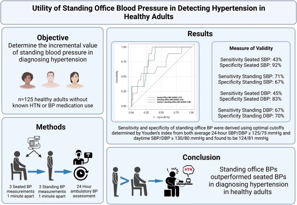 An older 2007 study found that, in 157 young students, standing resulted in the lowest blood pressure reading, compared with sitting or lying down. It is also typical for a person’s blood pressure to drop when they move from a seated or lying position to a standing position.