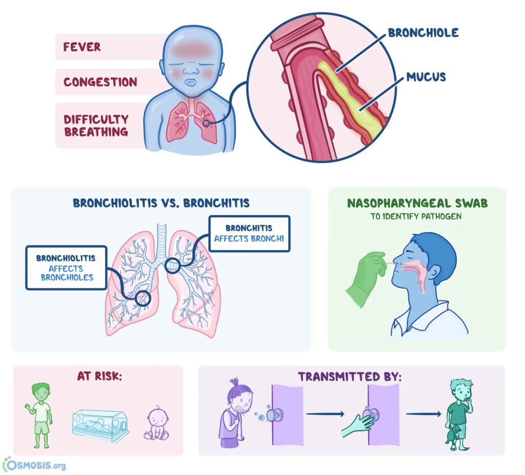 Bronkiolitis er en almindelig lungeinfektion hos spædbørn og små børn. Den forårsager inflammation og tilstopning i de mindste luftveje i lungerne, kendt som bronkiolerne. Disse små rør fører luften ud til lungeblærerne (alveolerne). Når de bliver betændte, svulmer de op og producerer mere slim, hvilket gør det svært for barnet at trække vejret.