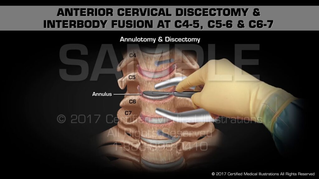 Dette er en af de mest almindelige operationer for problemer i nakken. Ved en ACDF-procedure laver kirurgen et lille snit på forsiden af halsen. Gennem dette snit fjernes den beskadigede diskus (diskektomi) for at fjerne trykket på nerverne. Det tomrum, der efterlades, fyldes med et knogletransplantat eller et bur af metal eller plast (en 'cage'), som fremmer en sammenvoksning (fusion) af de to hvirvler, C5 og C6, eller C6 og C7. Over tid vokser hvirvlerne sammen til en solid knogleblok, hvilket stabiliserer segmentet og forhindrer smertefuld bevægelse.