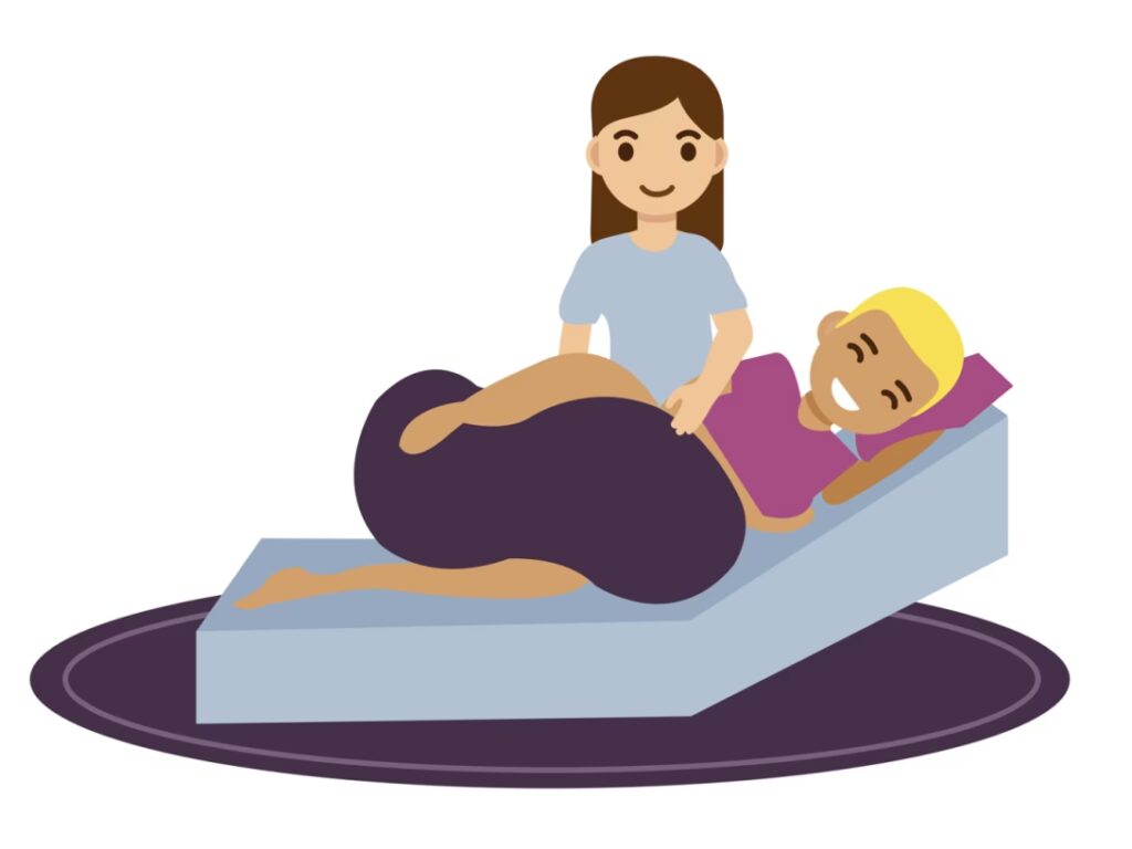 • Kan bruges med epiduralblokade: Hvis du har fået en epidural og har begrænset bevægelighed, er sideliggende en fremragende mulighed. Din partner eller jordemoder kan hjælpe dig med at placere en "peanut-bold" (en aflang, peanutformet bold) mellem dine ben for at holde bækkenet åbent.