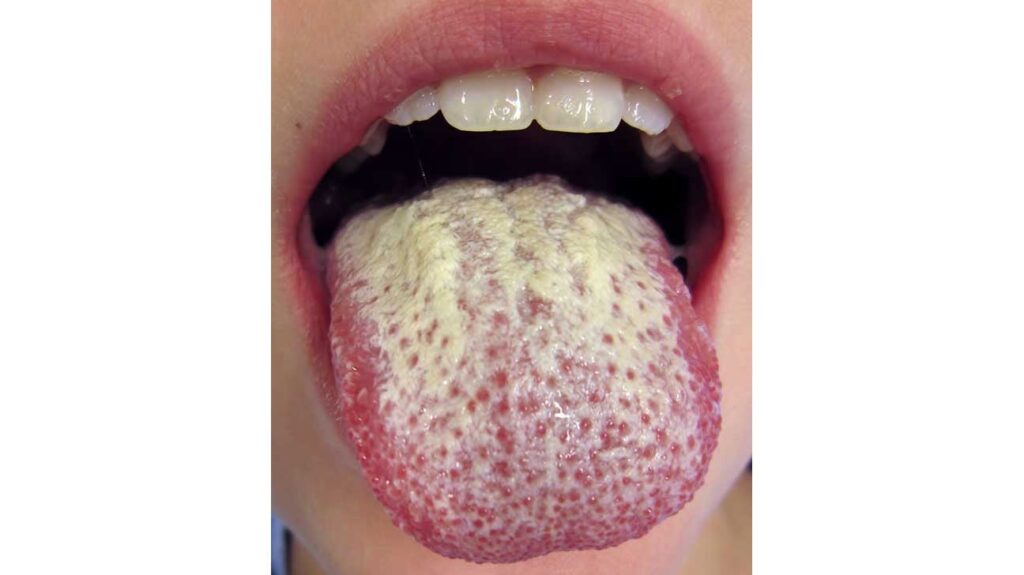 - Cremefarvede eller hvide, let hævede belægninger på tungen, indersiden af kinderne, tandkødet, mandlerne eller i ganen.