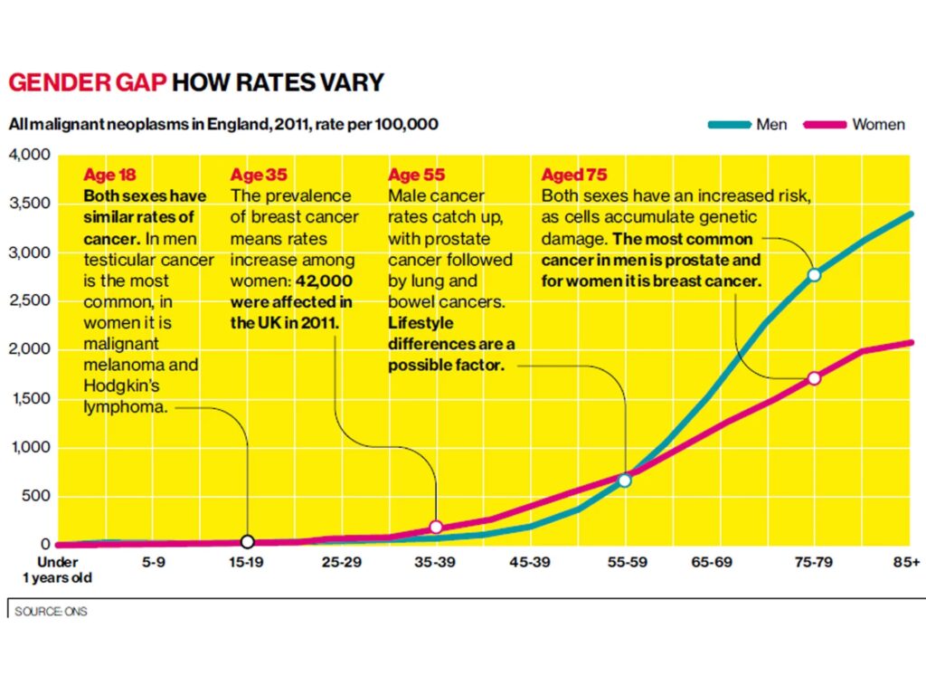The most common cancers in older people are cancers of the skin, lung, colon and rectum, breast (in women), and prostate (in men). Many cancers in older adults are linked to lifestyle-related risk factors (such as smoking, having excess body weight, or not getting enough physical activity) or to other environmental factors.