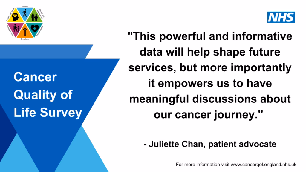 Den engelske "Cancer Quality of Life Survey" blev lanceret som et pilotprojekt i september 2020 for patienter med bryst-, prostata- og tyktarmskræft. Siden oktober 2021 er undersøgelsen blevet rullet ud til at omfatte alle kræftpatienter i England, som inviteres til at deltage cirka 18 måneder efter deres diagnose. Dette tidspunkt er valgt, fordi det ofte er her, de langsigtede konsekvenser af behandlingen bliver tydelige, og patienten overgår fra intensiv behandling til en ny hverdag.