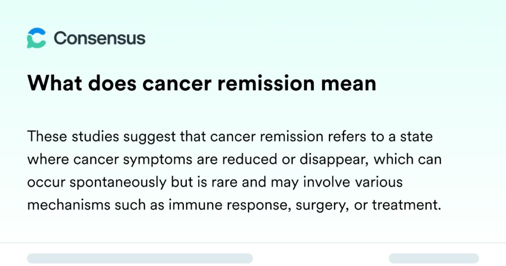 I sin enkelthed refererer remission til en betydelig reduktion eller forsvinden af kræftens tegn og symptomer. Ifølge National Cancer Institute (NCI) skal en person have en reduktion i antallet eller sværhedsgraden af sine symptomer for at være i remission. Det indikerer, at behandlingen virker, og at sygdommen er under kontrol. Remission kan vare alt fra uger til mange år, enten under eller efter behandlingen er afsluttet. Det er dog vigtigt at skelne mellem remission og helbredelse. Hvis en person er helbredt for kræft, betyder det, at der ikke er nogen spor af sygdommen tilbage i kroppen, og at den ikke vil vende tilbage. Da der stadig kan eksistere kræftceller i kroppen under remission, kan kræften potentielt vende tilbage, hvilket kaldes et tilbagefald.