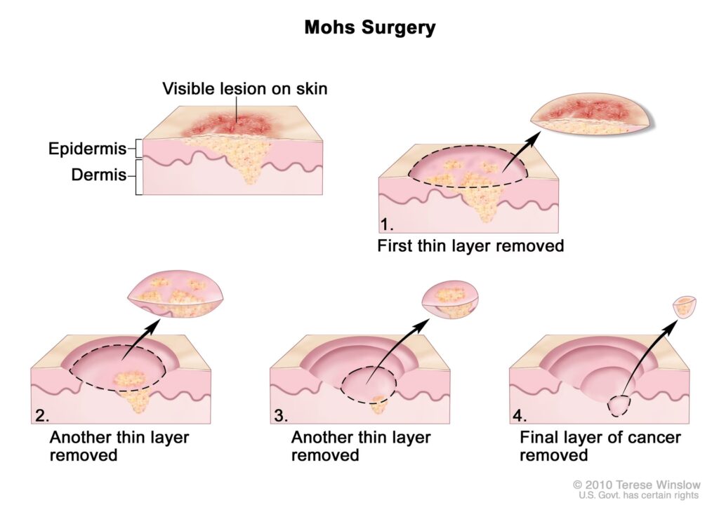 - Lokal fjernelse: Ved meget tidlige stadier kan man nøjes med at fjerne selve tumoren og en lille margin af raskt væv omkring den. Dette kan gøres med laser, mikrokirurgi eller almindelig kirurgi.