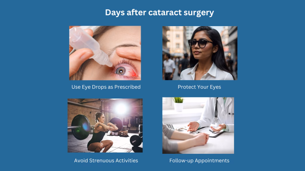 For at forhindre infektioner skal du undgå at få vand direkte i øjet. Det betyder ingen svømning i pools eller spabade i mindst to til fire uger. Når du tager bad, så prøv at holde ansigtet væk fra bruserstrålen. Beskyt også dit øje mod støv, vind og stærkt sollys ved at bære solbriller, når du er udendørs.