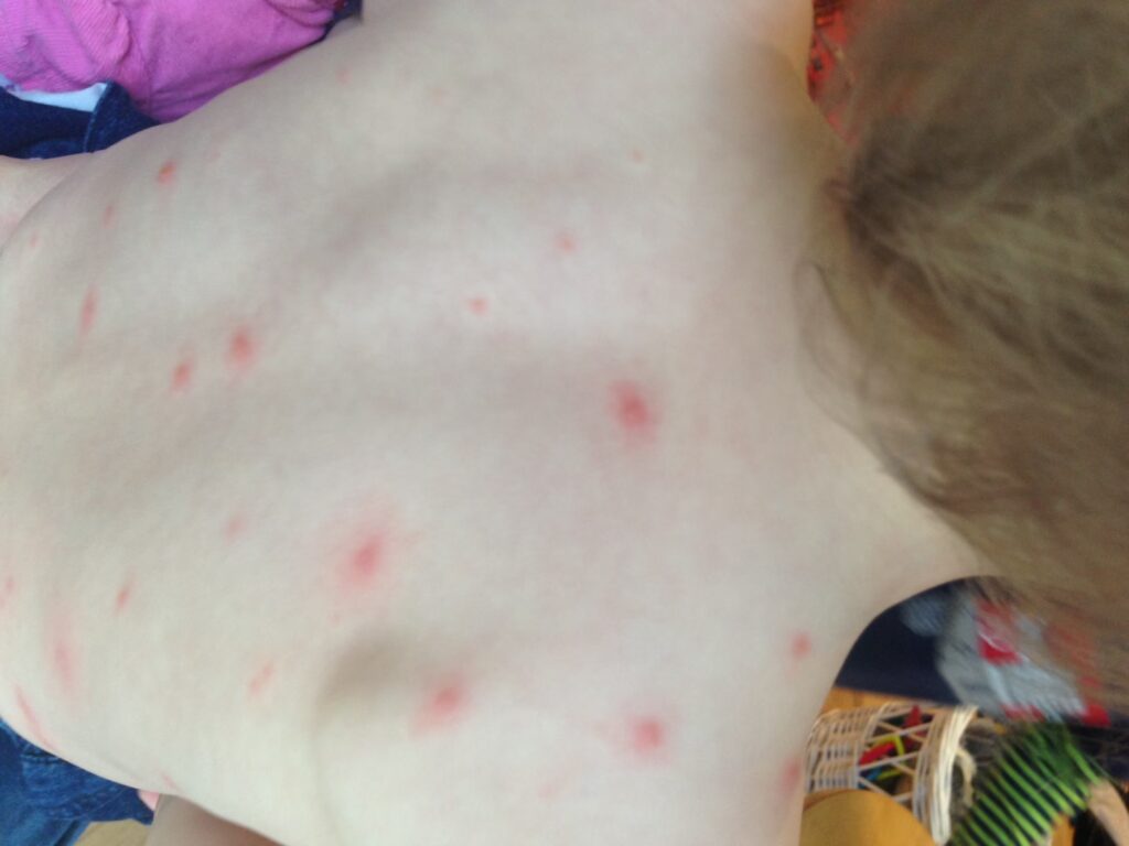Type af udslætStarter som røde pletter, udvikler sig til kløende, væskefyldte blærer, der danner skorper.Småplettet, sammenflydende udslæt. Starter ofte bag ørerne og spreder sig ned over kroppen.