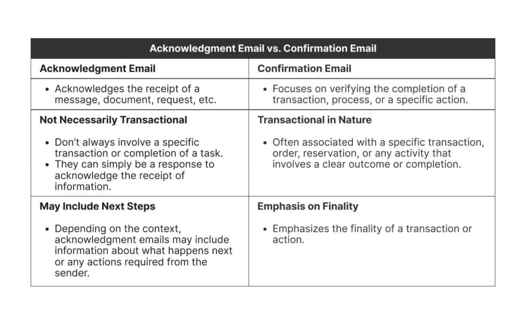En modtagelsesbekræftelse er en kort besked, hvis primære formål er at informere afsenderen om, at deres e-mail er modtaget. Den fungerer som en kvittering og kan indeholde en tidslinje for, hvornår et mere detaljeret svar kan forventes. Et fuldt svar, derimod, adresserer selve indholdet af e-mailen, besvarer spørgsmål, giver den ønskede information eller løser det problem, der blev præsenteret. En bekræftelse er et midlertidigt skridt, mens et fuldt svar er den endelige handling.