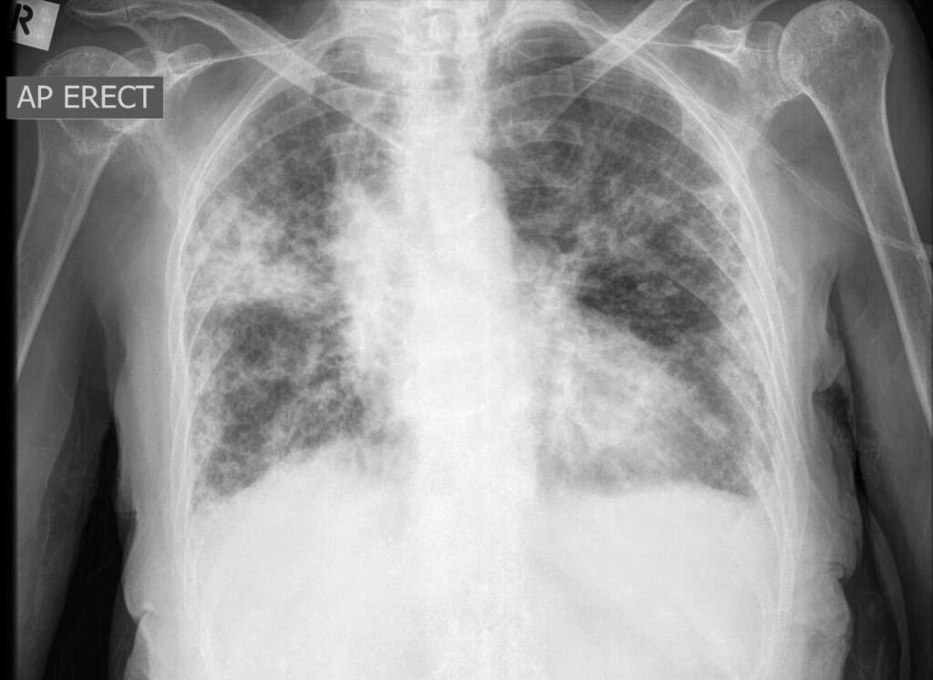 • Røntgenbillede af brystkassen: Dette er ofte den første test. Et område med konsolidering vil fremstå som et hvidt eller uigennemsigtigt (opakt) område i modsætning til det mørke, luftfyldte, raske lungevæv.