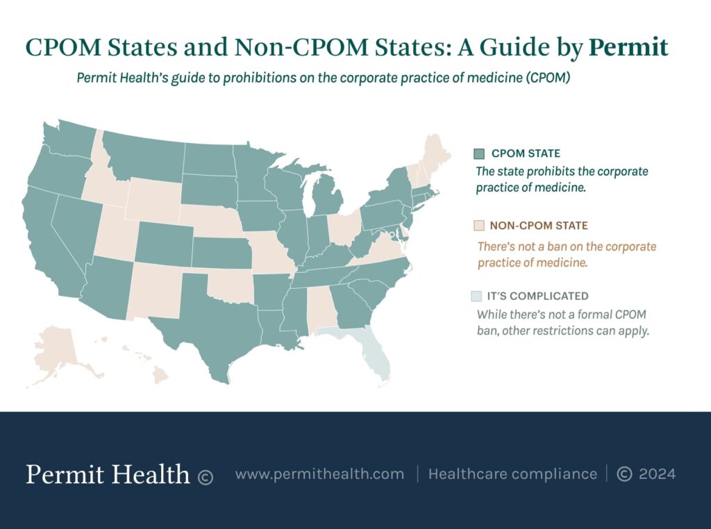 Florida repræsenterer en interessant mellemvej. Staten har ikke en formel CPOM-doktrin, der forbyder selskabers ejerskab. I stedet har man valgt en regulatorisk tilgang. Florida Health Care Clinic Act kræver, at enhver klinik, der ikke er fuldt ejet af læger og som søger refusion fra tredjeparter (forsikring, Medicare, etc.), skal opnå en særlig licens. Dette system fokuserer på tilsyn, økonomisk ansvarlighed og baggrundstjek af ejere for at bekæmpe svindel, snarere end at forbyde en bestemt ejerskabsmodel.
