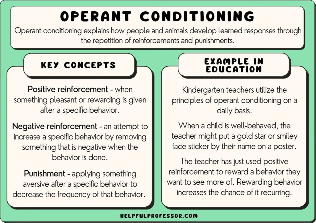 Et klassisk eksempel er laboratorierotten i en "Skinner-boks". Når rotten trykker på et håndtag, mens et grønt lys er tændt, modtager den en madpille som belønning. Hvis den trykker på håndtaget, når et rødt lys er tændt, får den et mildt elektrisk stød. Som resultat lærer rotten at trykke på håndtaget ved grønt lys og undgå det ved rødt lys. Denne simple mekanisme er grundlaget for en stor del af den adfærd, vi ser omkring os hver dag.