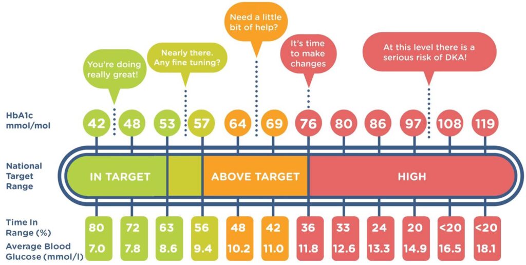 For personer med diabetes er målet at holde blodsukkeret så tæt på det normale som muligt for at undgå komplikationer. Målene kan dog være individuelle og bør altid aftales med en læge.