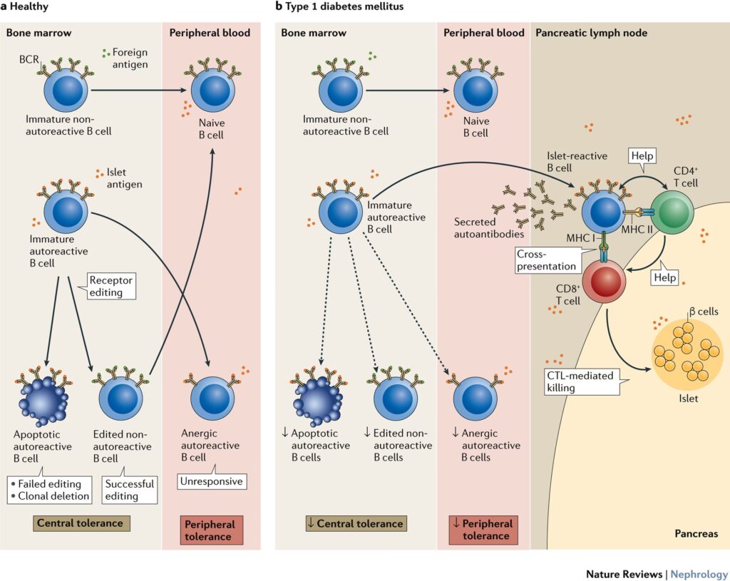 Type 1-diabetes er en autoimmun sygdom. Det betyder, at kroppens eget immunforsvar ved en fejl identificerer betacellerne som fremmede og farlige. Immunforsvaret iværksætter et angreb og ødelægger systematisk betacellerne i bugspytkirtlen. Når tilstrækkeligt mange betaceller er ødelagt, kan kroppen ikke længere producere insulin. Dette fører til en absolut insulinmangel.