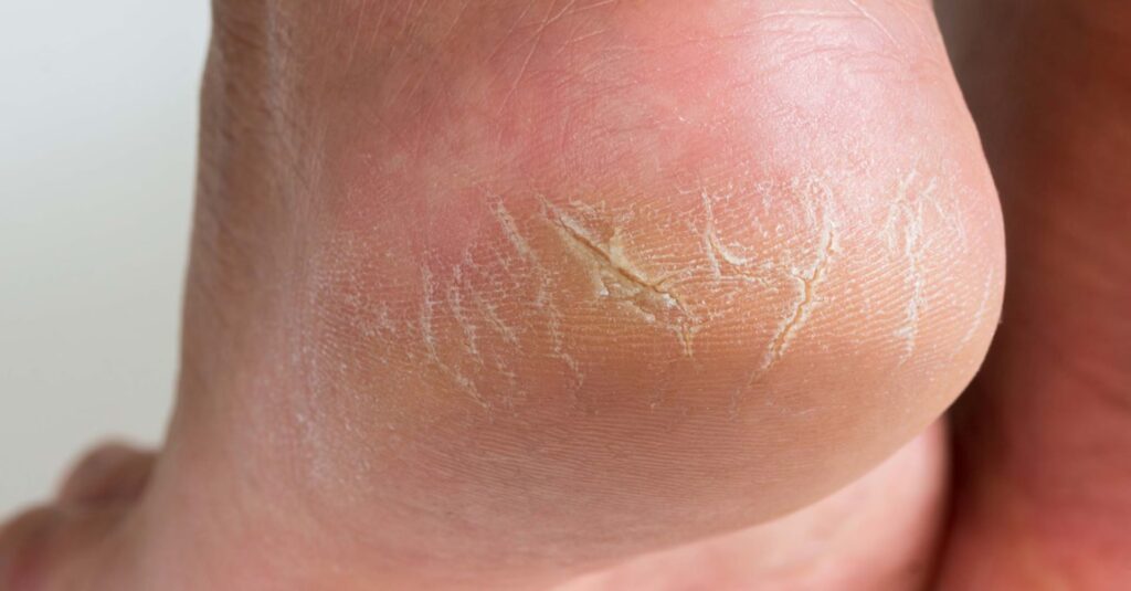 • Fissurer: Dybe, smertefulde revner kan opstå, især på hæle og fodsåler, hvor huden er tyk.