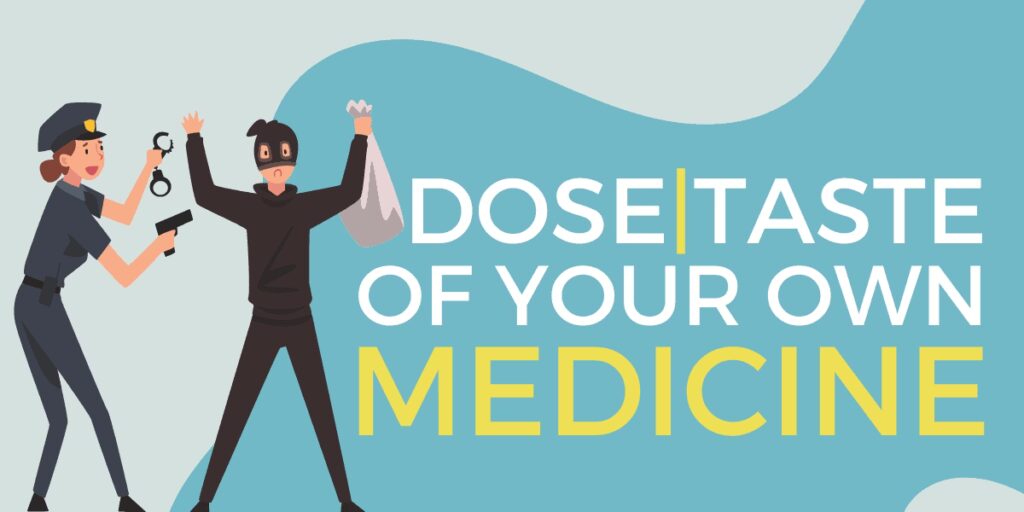 Det blev en måde at beskrive retfærdighed eller karma på: Når en person, der er kendt for sin hårde eller uretfærdige behandling af andre, selv bliver udsat for det samme. Det kan være chefen, der altid kritiserer sine medarbejdere for småfejl, og som pludselig selv bliver genstand for en detaljeret granskning af sin egen chef. Eller personen, der elsker at sprede sladder, og som en dag opdager, at ondsindede rygter florerer om ham eller hende selv. I alle disse tilfælde serveres en "dosis af egen medicin", og den er sjældent behagelig at sluge.