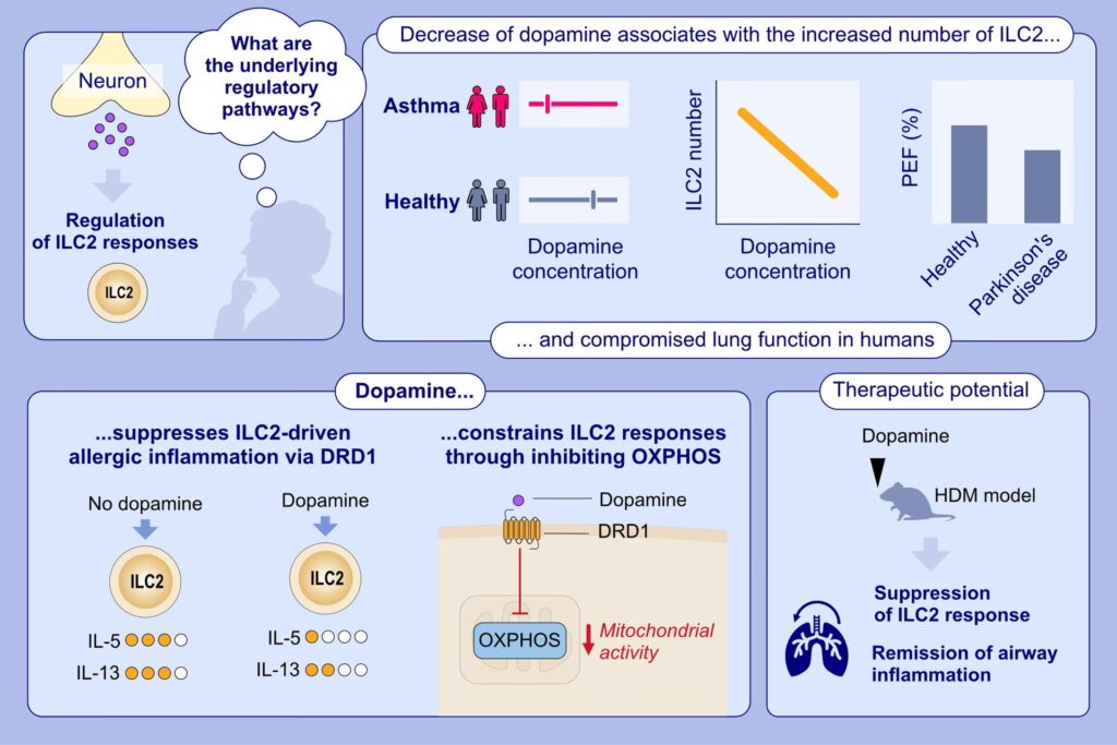 Den mest lovende del af forskningen kom fra forsøg med dyremodeller for allergisk astma. Forskere observerede, at når de lokalt fjernede dopaminproducerende nerver i lungerne på mus, blev ILC2-responsen og den efterfølgende luftvejsinflammation kraftigt forøget.