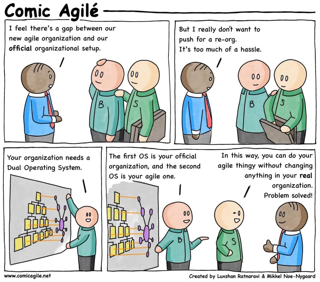Hvad der skete her, var, at direktøren, måske ubevidst, skabte et dobbelt operativsystem. Det formelle hierarki fortsatte med at drive den eksisterende olieforretning med fokus på stabilitet og trinvise forbedringer. Samtidig fik et lille, passioneret netværk af frivillige (ledet af brand manageren) frihed til at eksperimentere og forfølge en helt ny og mere risikabel mulighed. Resultatet? De lancerede tolv nye produkter i fire kategorier på kun seks måneder – en hastighed, der ville have været utænkelig inden for hierarkiets stramme rammer.