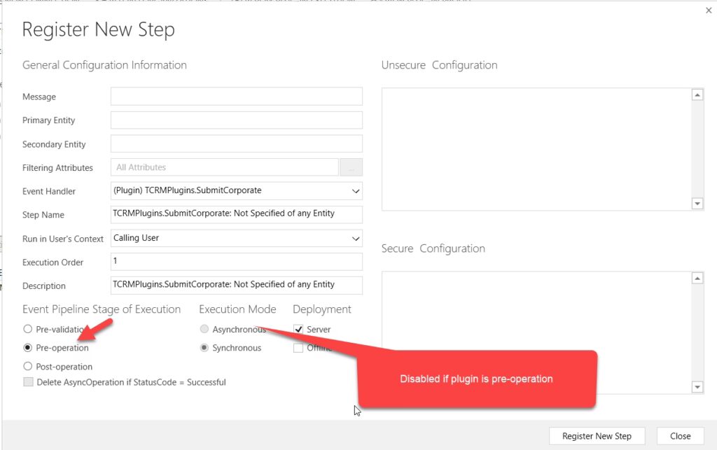 Det er kritisk, at Execution Mode er sat til synkron. Asynkrone plugins kører i baggrunden, efter transaktionen er afsluttet, og kan ikke bruges i Pre-Operation-fasen.