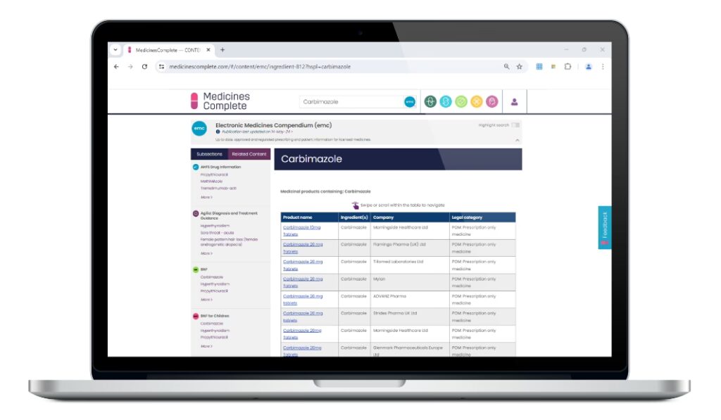 For sundhedsprofessionelle er værdien af eMC yderligere forstærket gennem dens integration med andre centrale værktøjer. Via platformen MedicinesComplete kan brugere finde direkte links fra eMC's lægemiddelinformation til den evidensbaserede og praktiske vejledning i British National Formulary (BNF) og BNF for Children. BNF er en af de mest anvendte ressourcer af læger og farmaceuter i Storbritannien og giver vejledning om valg af lægemidler, dosering og administration. Denne integration giver professionelle mulighed for hurtigt at skifte mellem den licenserede produktinformation (hvad medicinen er godkendt til) og praktisk klinisk vejledning (hvordan den bedst anvendes), hvilket understøtter en velinformeret og sikker beslutningstagning.