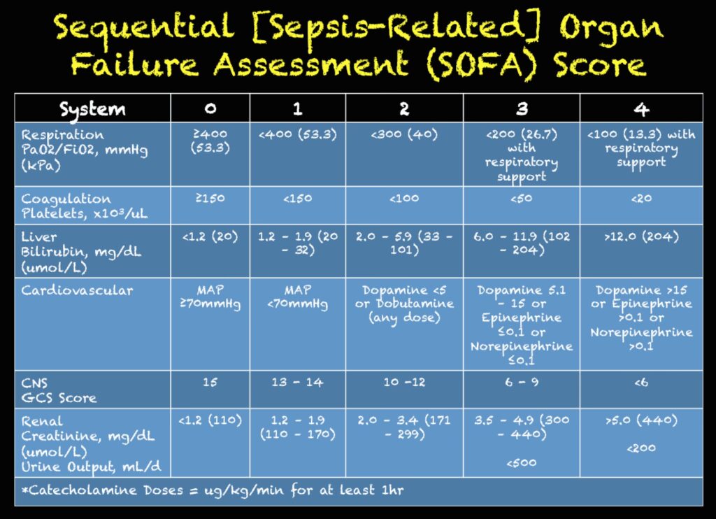 For hvert organsystem tildeles en score fra 0 (normal funktion) til 4 (sværeste grad af svigt). Den samlede SOFA-score er summen af scorerne for de seks systemer, hvilket giver en score mellem 0 og 24. En stigende SOFA-score over tid indikerer en forværring af patientens tilstand og er forbundet med en højere dødelighed.