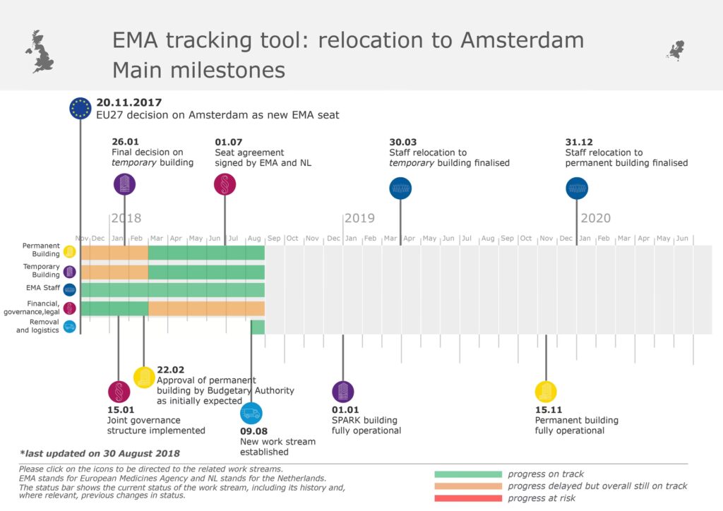 Med beslutningen på plads begyndte det virkelige arbejde. EMA og den hollandske regering har kun lidt over 16 måneder, fra beslutningstidspunktet i slutningen af 2017 til den endelige deadline den 30. marts 2019, til at gennemføre hele flytningen. Dette er en ekstremt ambitiøs tidsplan for en operation af denne størrelse. Projektet involverer ikke kun den fysiske flytning af udstyr og arkiver, men også tilpasning af en ny bygning, etablering af ny IT-infrastruktur og, vigtigst af alt, at hjælpe hundredvis af medarbejdere og deres familier med at flytte til et nyt land. Udfordringen ligger i at udføre denne komplekse manøvre uden at forstyrre agenturets kerneopgaver. Enhver forsinkelse i evalueringen af nye lægemidler eller overvågningen af eksisterende medicin kan have direkte konsekvenser for patienter i hele EU. For at sikre gennemsigtighed har EMA forpligtet sig til at offentliggøre et overvågningsskema på deres hjemmeside, så offentligheden og interessenter kan følge fremskridtene i flytteprojektet.