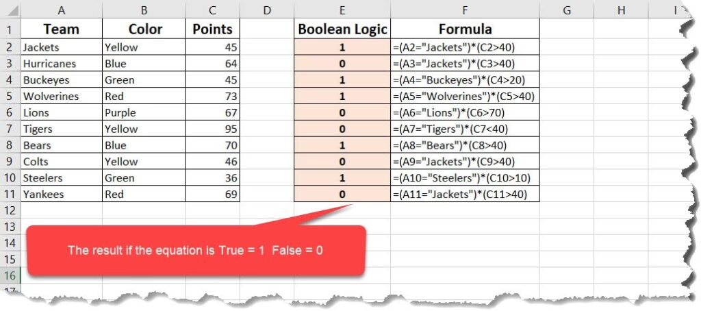 En interessant egenskab ved Booleske værdier er, hvordan Excel behandler dem i matematiske formler. De fleste funktioner som SUM, AVERAGE og COUNT ignorerer celler, der indeholder de logiske værdier SAND eller FALSK.