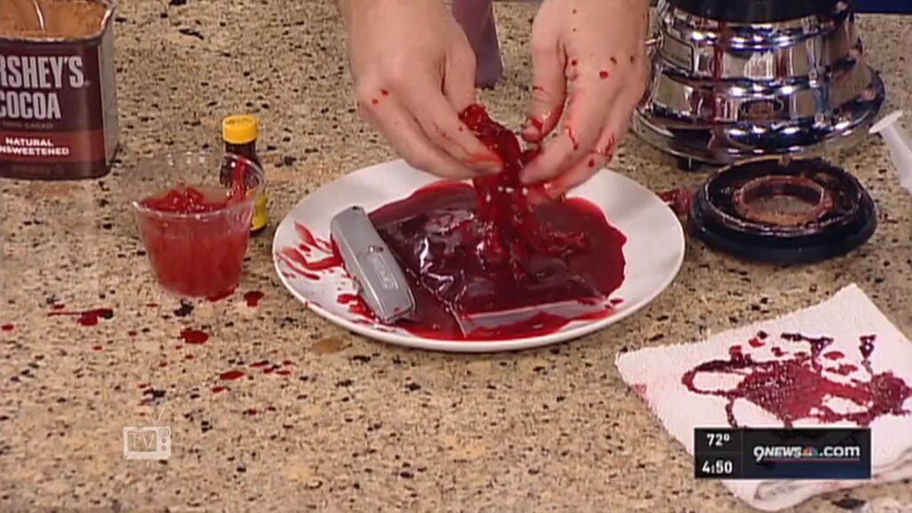 - Farvejustering (grøn/blå frugtfarve, kakaopulver, chokoladesirup): Rigtigt blod er ikke bare lyst rødt. En lille smule grøn eller blå farve kan neutralisere det pink skær fra rød frugtfarve og give en dybere, mere autentisk rød farve. Chokoladesirup og kakao tilføjer både mørke og uigennemsigtighed.