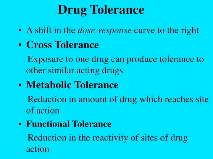 Lægemiddeltolerance opstår, når en persons reaktion på et lægemiddel aftager over tid, hvilket betyder, at der kræves større doser for at opnå den samme effekt, som man oprindeligt fik med en mindre dosis. Dette er en fysiologisk tilstand, hvor kroppen tilpasser sig den konstante tilstedeværelse af et stof. Det er vigtigt at skelne tolerance fra afhængighed, selvom de ofte er forbundne. Afhængighed er en mere kompleks tilstand, der involverer en tvangspræget trang til at bruge et stof på trods af negative konsekvenser.