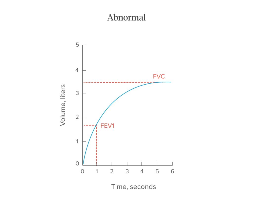 - Ved obstruktive lungesygdomme (f.eks. KOL): Personen har svært ved at puste luften hurtigt ud på grund af forsnævrede luftveje. Derfor vil FEV1 være markant nedsat, mens FVC kan være tættere på normalen. Dette resulterer i en lav FEV1/FVC-ratio (typisk under 70%).