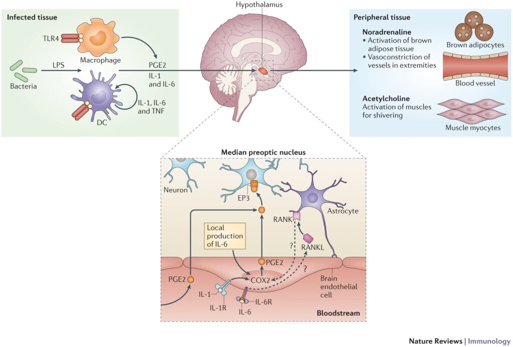 - Humoral signalering: Som beskrevet ovenfor er dette den mest veldokumenterede mekanisme. Proinflammatoriske cytokiner i blodet stimulerer endotelceller i hjernen til at producere PGE2, som derefter virker direkte på hypothalamus.