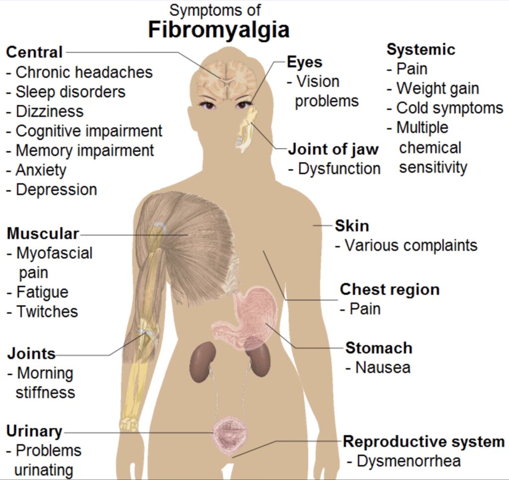 | Tørre eller rindende øjne | Triggerpunkter i SCM-musklen. Kan også være relateret til Sjøgrens syndrom, som ses hyppigere hos fibromyalgipatienter. | Fugtgivende øjendråber (kunstige tårer), blid massage af nakke/hals, udredning for Sjøgrens. |