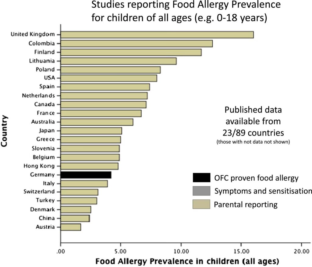 - Zürich, Schweiz: Havde den højeste forekomst af sandsynlig fødevareallergi (5.6%). De mest almindelige allergener var hasselnød, fersken og æble, hvilket stærkt indikerer en sammenhæng med pollenallergi.
